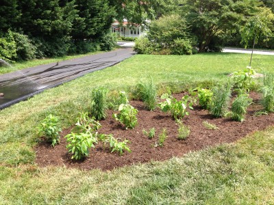 When you receive your approval and your grant money you submit a deposit to us. We then design your projects and build them. We install signage so the neighborhood knows what the beds are for and can help maintain them. Here are some examples of beds installed under the Community Stormwater Partnership Grant in Ellicott City last year! Reach out today if your HOA (click here) is interested.