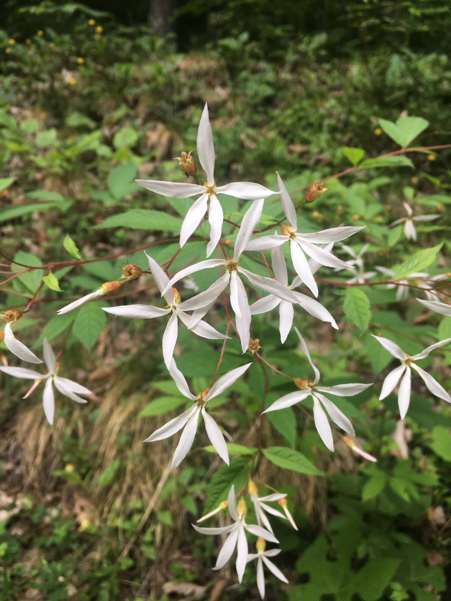 A member of the Rose Family (Rosaceae), Bowman’s Root has the five, separate petals characteristic of most wild members of that family. The petals are white or pale pink, narrow, and often twisted, somewhat resembling those of Amelanchier species. The leaves are nearly sessile, three-parted, and sharply toothed. Once pollinated, the flowers form hairy fruits. In Maryland Bowman’s Root occurs mainly in rich woods of the western mountains, but there are scattered occurrences in the Piedmont and the western Coastal Plain.