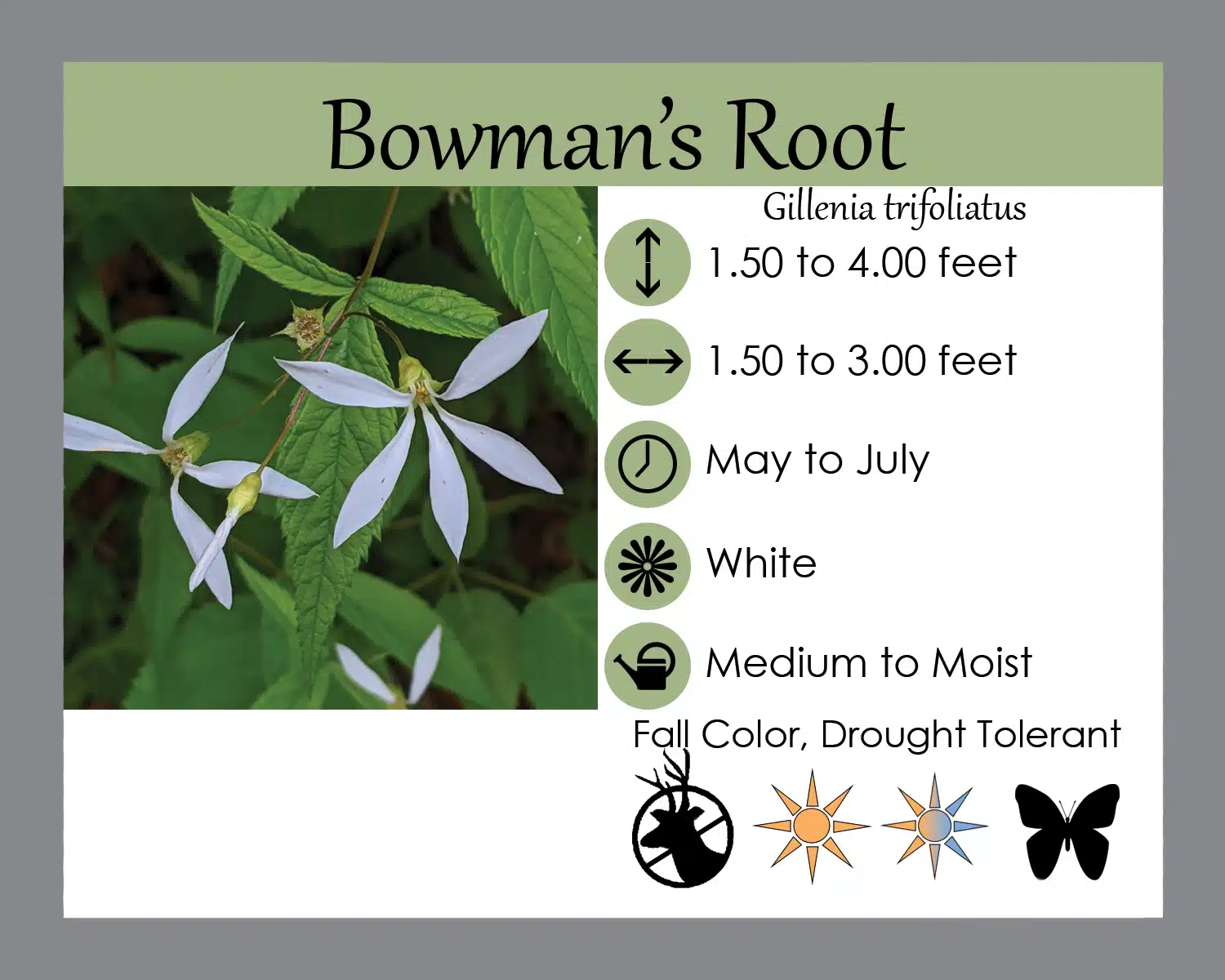 Gillenia trifoliatus, or Bowman’s root, grows in full sun to light shade in moist to average soil conditions. This plant prefers mountainous habitats and can be found in dry to moist upland woods and rocky banks. It can tolerate drought conditions once established. Over time, the plant spreads into tight clumps that seldom needs dividing. Where temperatures are hotter it is usually found in shadier conditions, for example woodlands dominated by oak species. Bowman’s root does well when planted in masses, especially along the edge of a woodland garden where the light transitions from shade to full sun. It is pest and disease-resistant and boats an especially unpalatable flavor to mammalian herbivores. Many pollinators, from butterflies to skippers to bees, use the flowers as a nectar source in the spring and early summer.