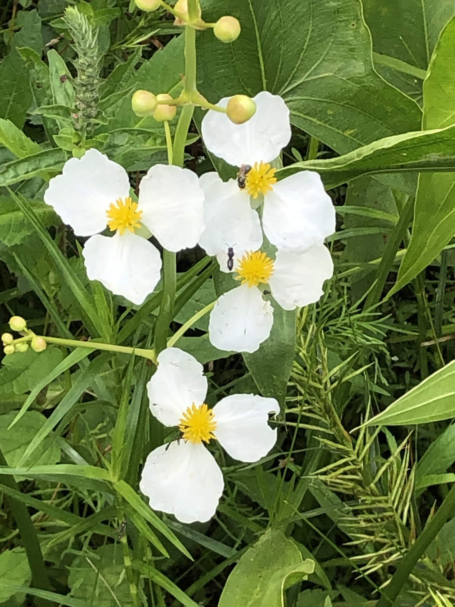 Sagittaria latifolia, also known as, arrowhead, duck potato, or wapato, is a vigorous, deciduous, marginal aquatic perennial that typically grows 1-4’ tall. It has arrowhead-shaped leaves as well as three-petaled white flowers from July to September. This plant commonly grows submerged in shallow water as well as in wet muddy banks. While this plant flowers best in full sun it can also handle part shade. Flowers are dioecious; male flowers have bushy yellow center stamens whereas female flowers have green centers. For planting, place tubers or runners in mud at the margins of a pond, stream bank, or in containers in a water garden, either along the shore or in up to 6-12” of water. Duck Potato reproduces by reseeding itself or by forming clonal plants from the tubers. While colonies of plants sometimes develop at favorable sites, flowers can be cut back before seeds develop to control spread.