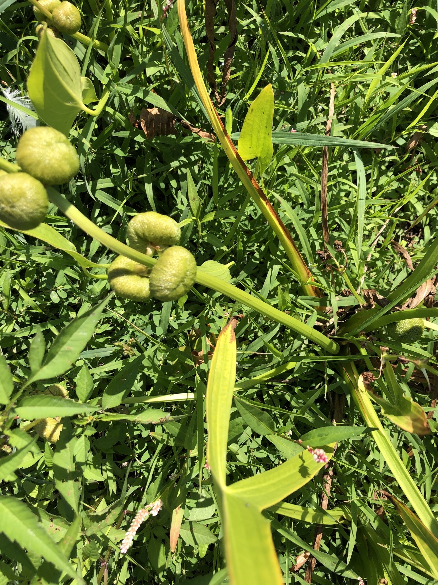 The common names duck potato and wapato refer to the round, starchy, golf ball-sized tubers that form at the ends of underground plant runners (rhizomes). These tubers will float to the surface if dislodged from the mud and are also edible. Subsequently they may be boiled or baked and eaten as a potato-like food. Historically, Native Americans have been known to harvest and consume these tubers. Additionally the tubers are an important food source for waterfowl and the seeds are attractive to many water birds and snapping turtles.