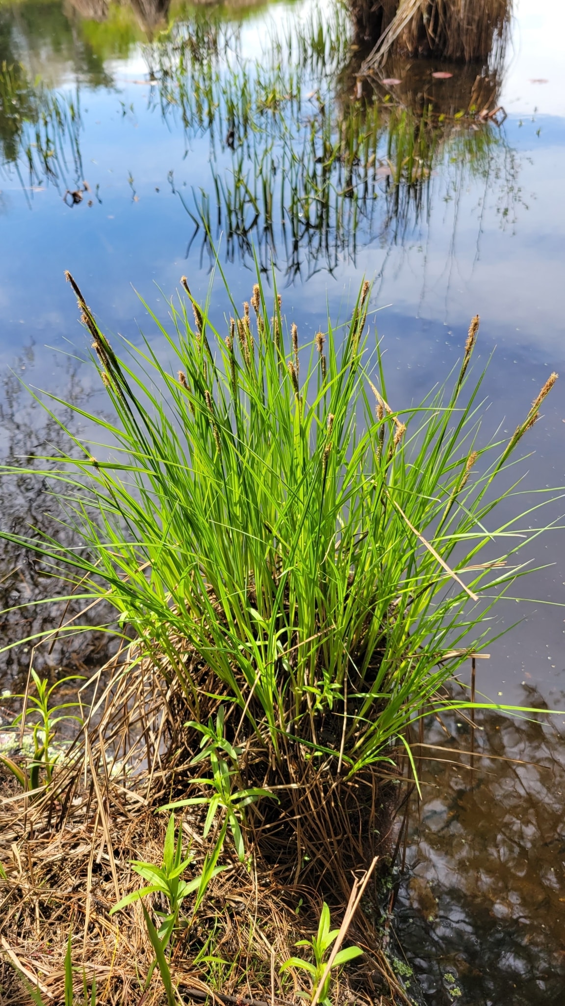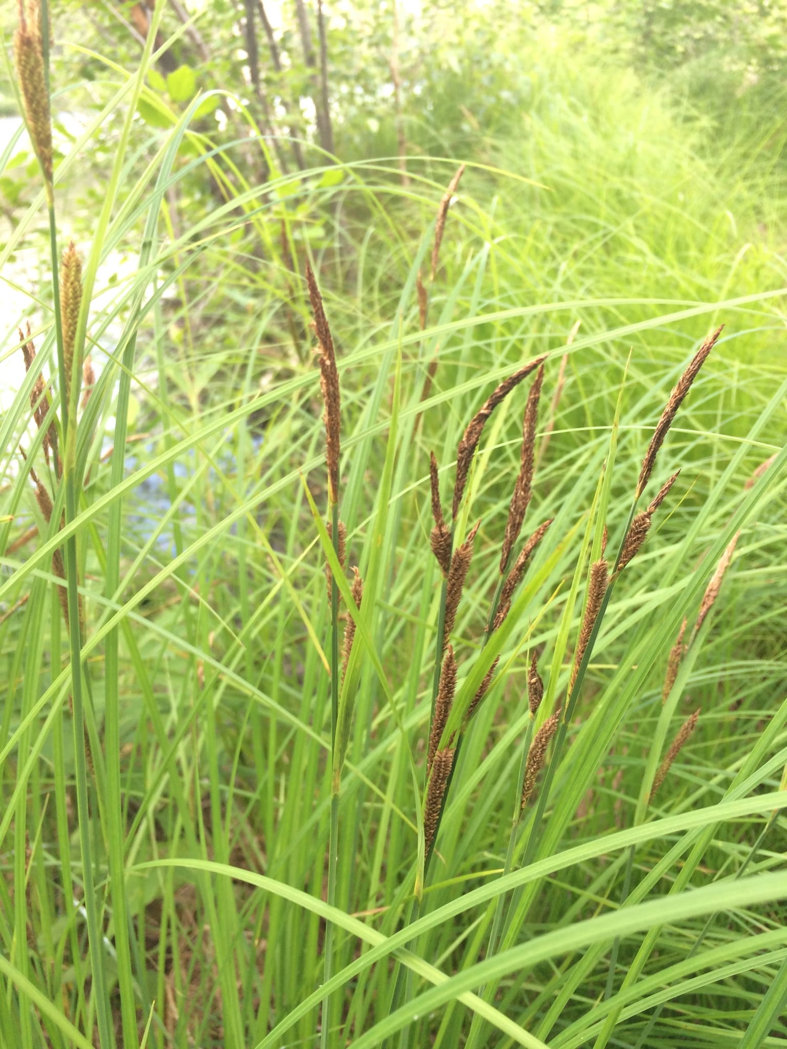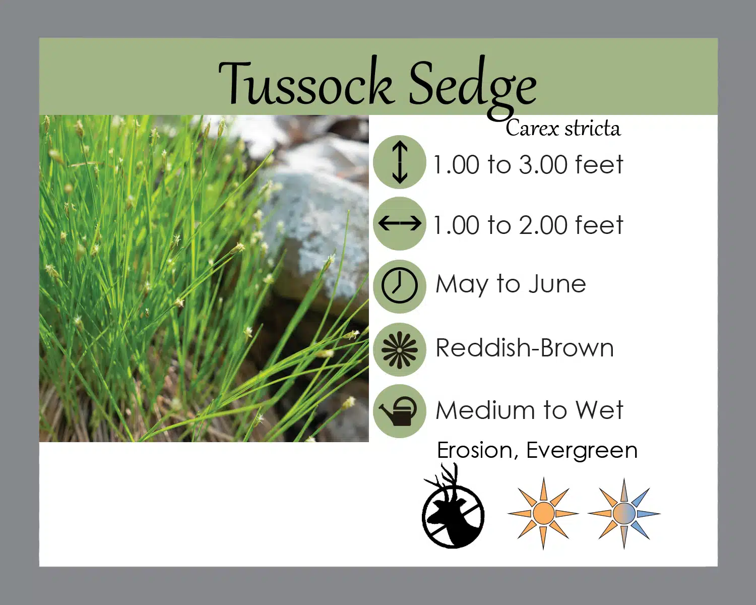 Carex stricta, known as Tussock sedge is a full sun to part shade species that thrives in sandy or mucky soil, it is also tolerant of intermittent flooding. It often grows around fresh-water marshes, swamps and bogs, and wet roadside ditches. The roots are dense, fibrous and rhizomatous which makes it an ideal choice for erosion control and an excellent addition to rain gardens. Additionally, this sedge has evergreen and elegant foliage that can grow up to 3′ tall and boasts gracefully-arching leaves that are fine-textured. This grass gets it’s common name from its natural growing habit; it forms dense tussocks (areas raised above the water line, in a marsh or bog, that are bound together by roots).